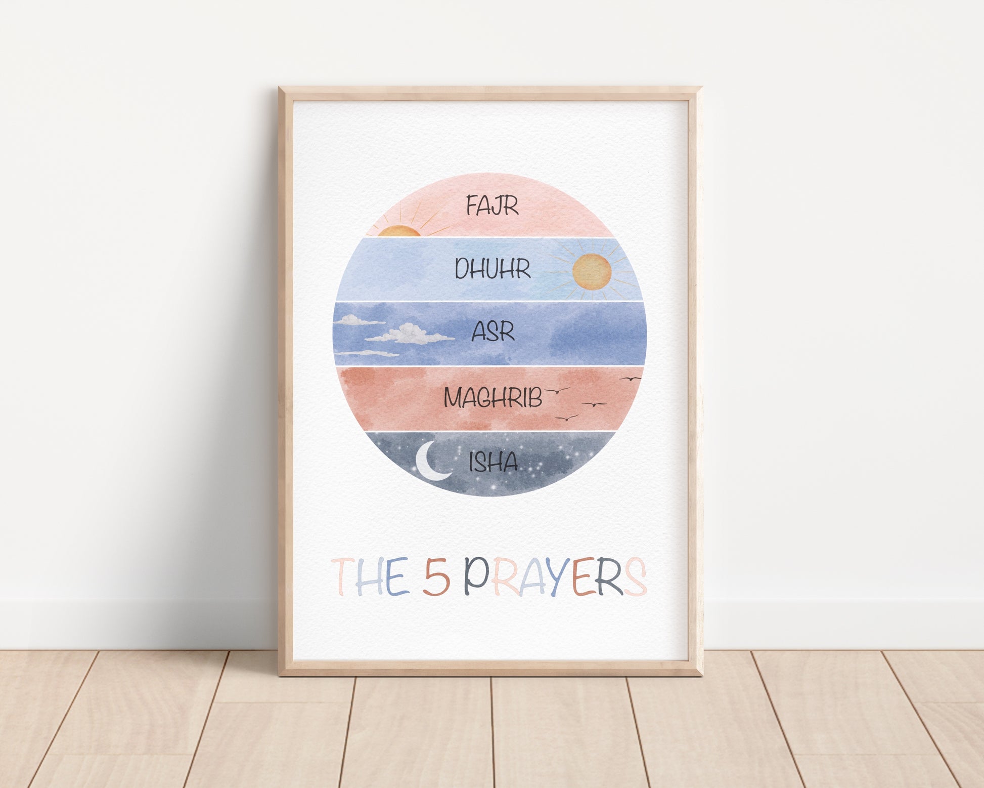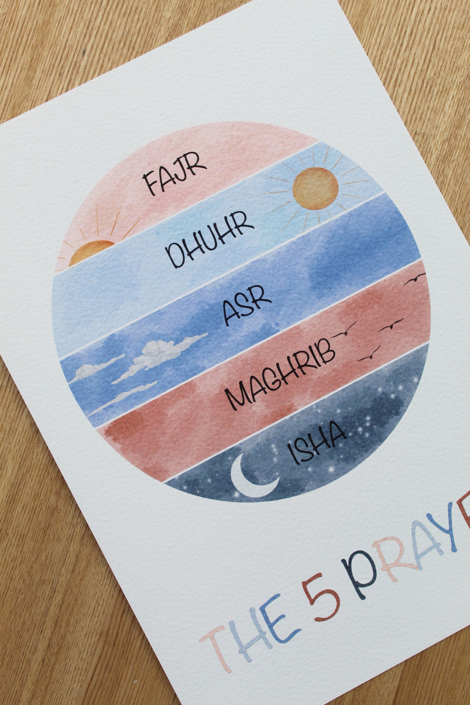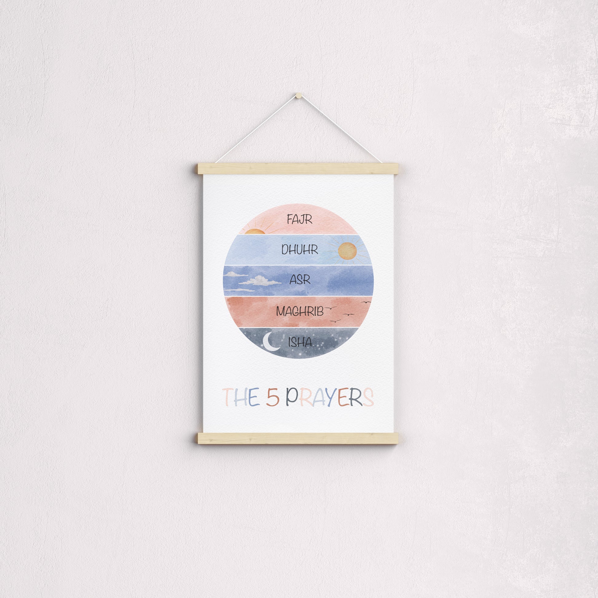 This poster vividly depicts the five daily prayers. With a stylish color gradient from sunrise to night, it conveys the meaning of prayer times to children in a loving way.