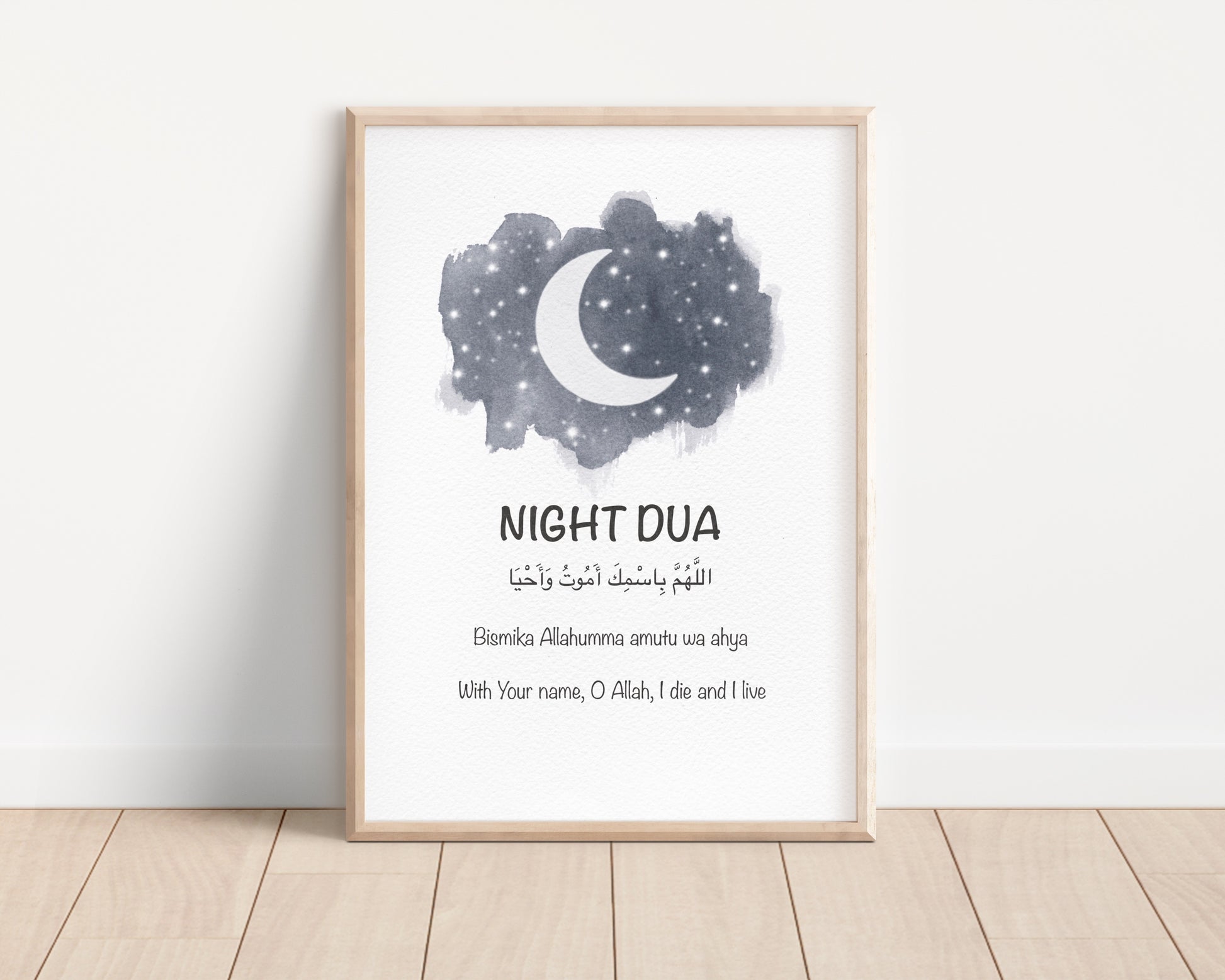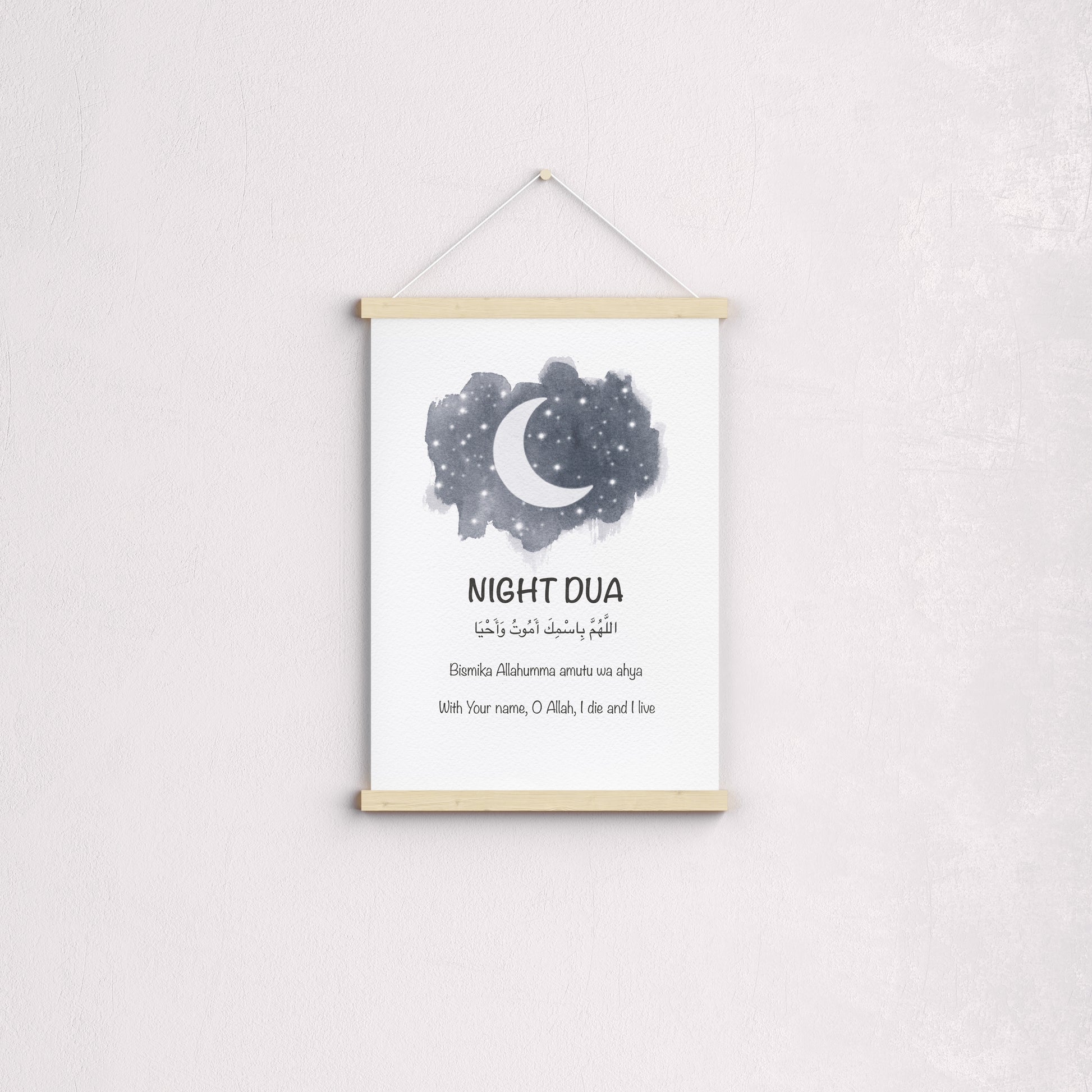 Die Abenddua als Poster – mit arabischem Text, Transliteration und Übersetzung. Das ruhige Mond- und Sternendesign schafft eine besinnliche Atmosphäre und eignet sich ideal als Abendritual im Kinderzimmer.